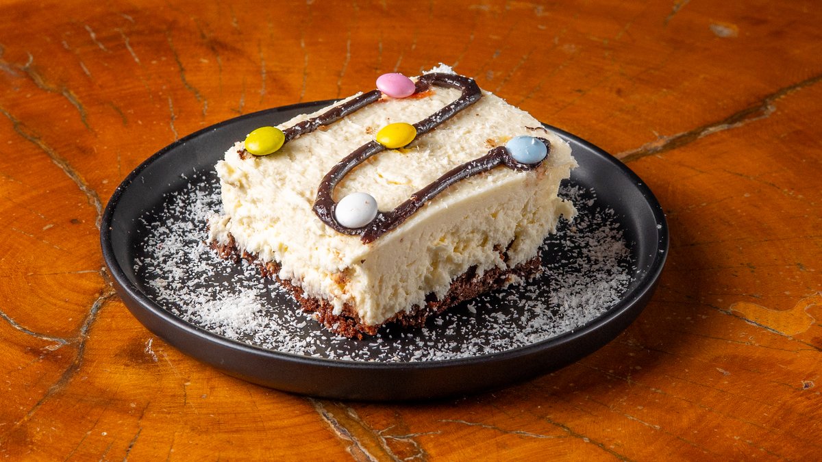 Σοκολατένιο κέικ ταψιού με σάλτσα γάλακτος, κρέμα καρύδας & smarties. Chocolate tray cake with milk sauce, coconut cream & smarties.