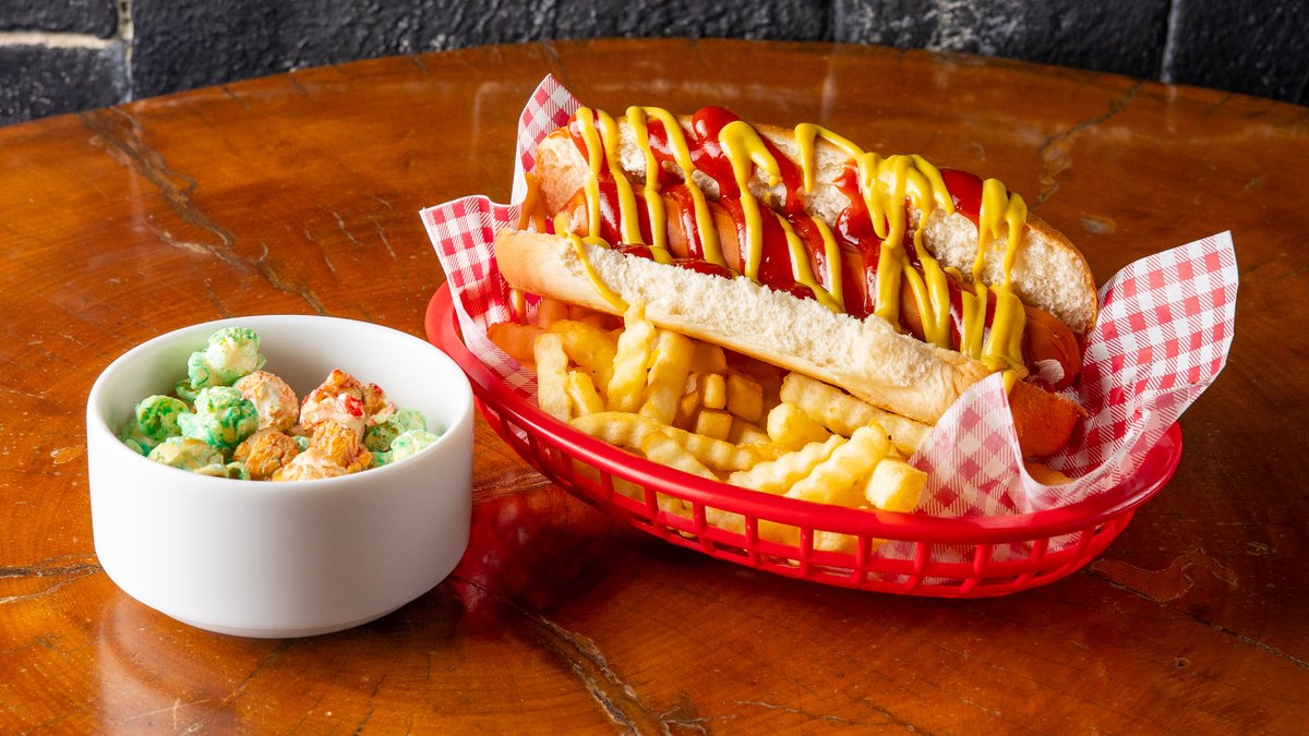 Hot dog 3 υλικών της επιλογής σου με πατάτες τηγανητές και popcorn