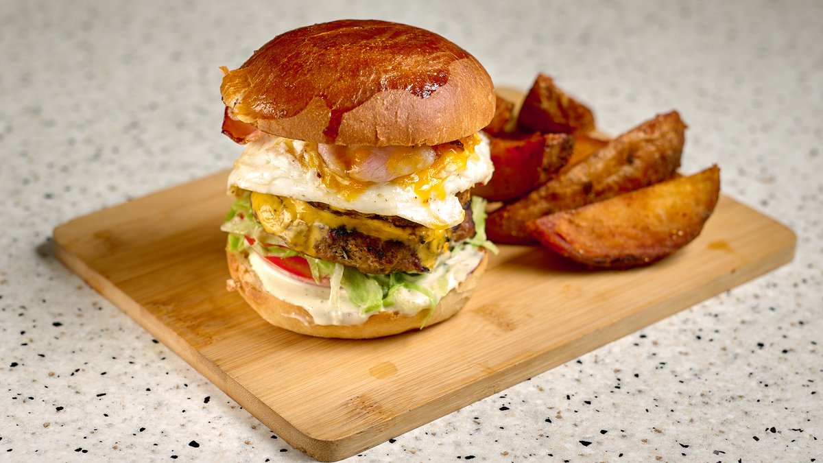 Double burger, cheddar, bacon, fried egg, tomato and 1000 island sauce. Served with potato wedges