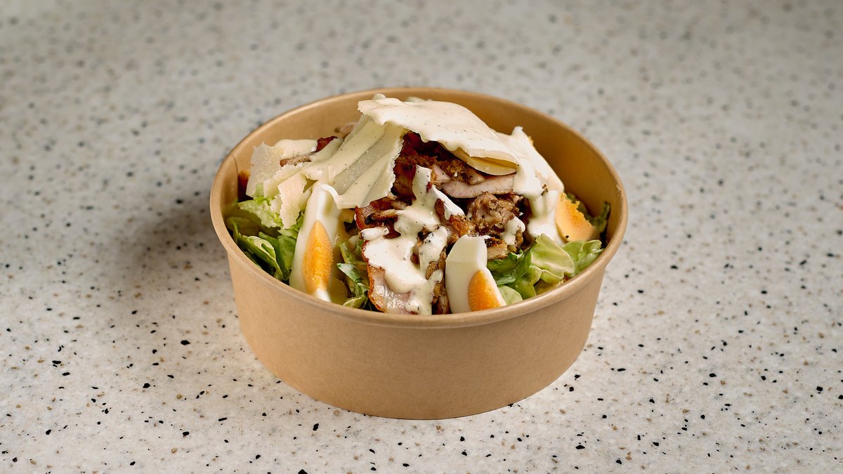 With lettuce, iceberg, grilled chicken thigh, croutons, bacon, boiled egg and caesar's dressing