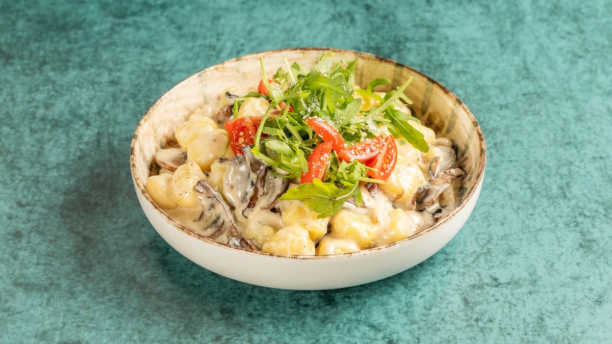 Vegeteria. Μανιτάρια shimeji, μανιτάρια λευκά, Gorgonzola dolce, grana padano, σκόρδο, κρέμα, baby ρόκα και ντοματίνια