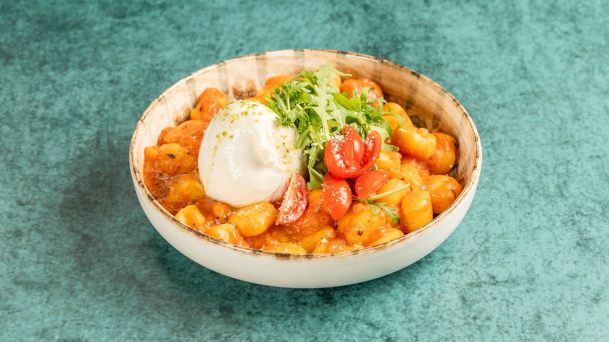 Vegeterian. Με φρέσκια τομάτα, burrata, baby ρόκα, ντοματίνια, pesto βασιλικού και grana padano