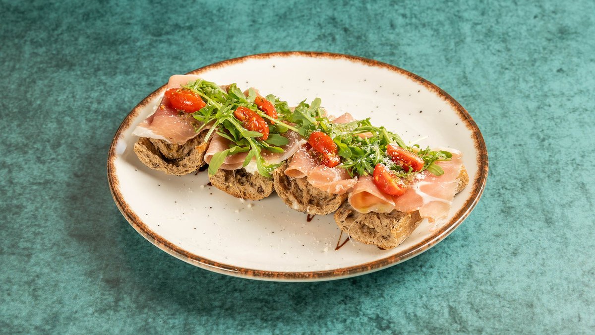 Prosciutto Parma, baby ρόκα, burrata, ντομάτα και pesto βασιλικού