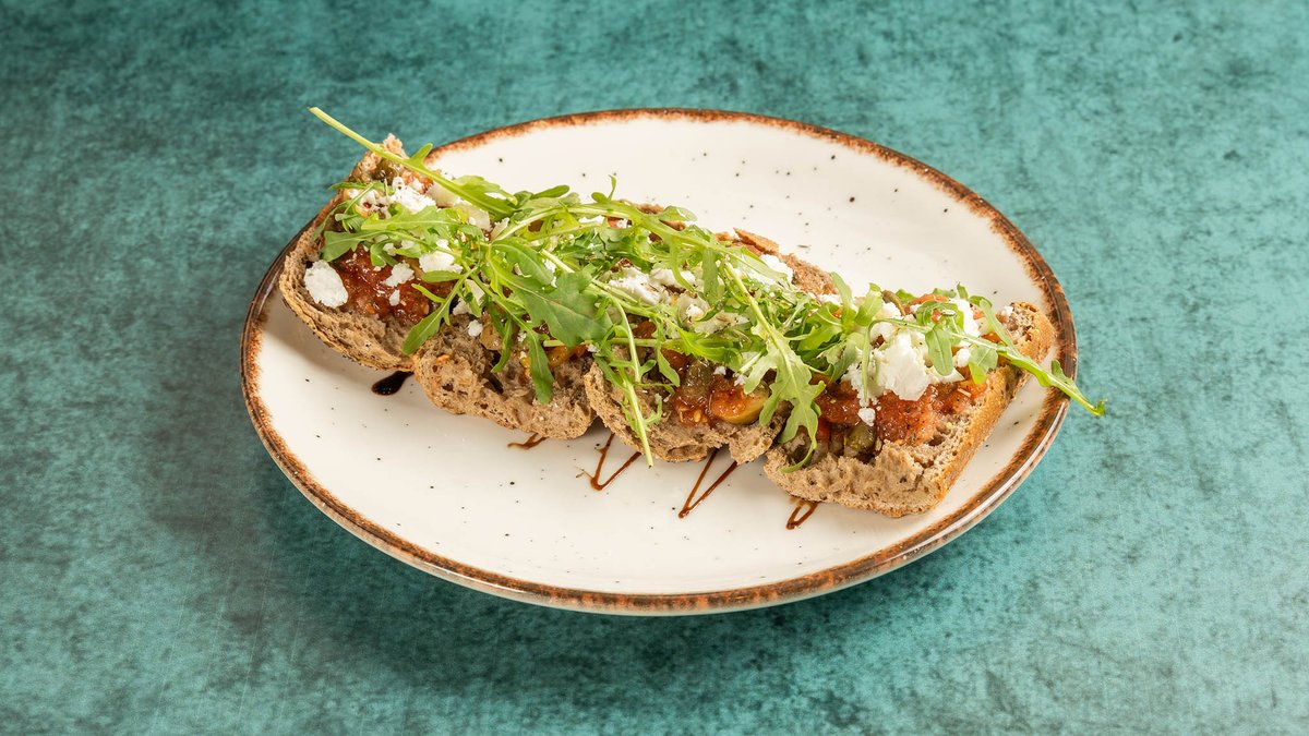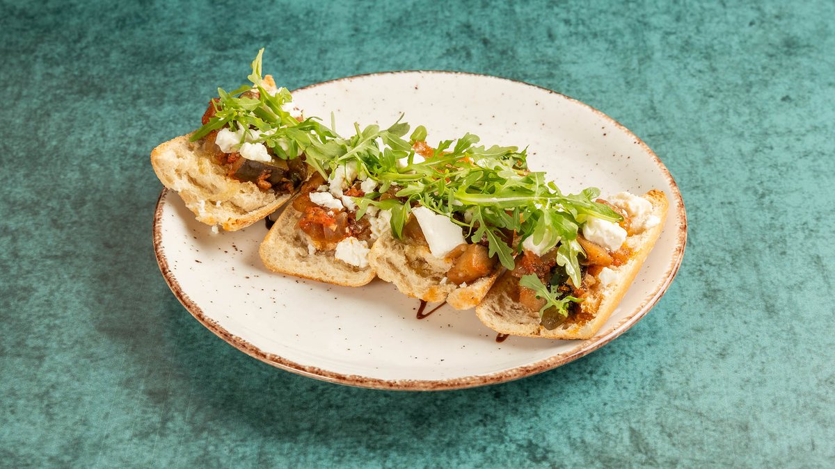 Vegeterian. Μελιτζάνα, τομάτα, κάπαρη, κρεμμύδι, ελιές, φέτα ΠΟΠ και baby ρόκα