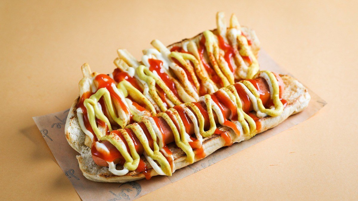 Με τυρί, λουκάνικο, κέτσαπ, μουστάρδα, μαγιονέζα, πατατάκια και καραμελωμένα κρεμμύδια