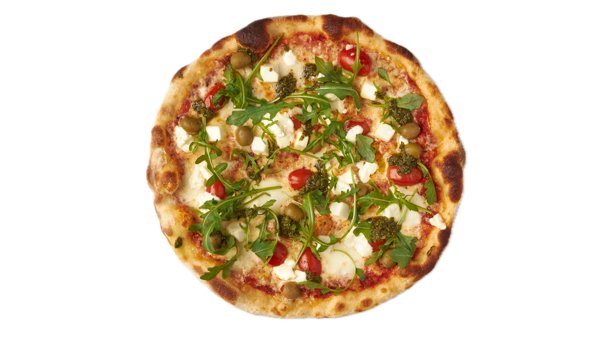 Με μανιτάρια, πιπεριές, καπνιστή γαλοπούλα και παρμεζάνα. Συνοδεύεται από πράσινη σαλάτα και ντοματίνια