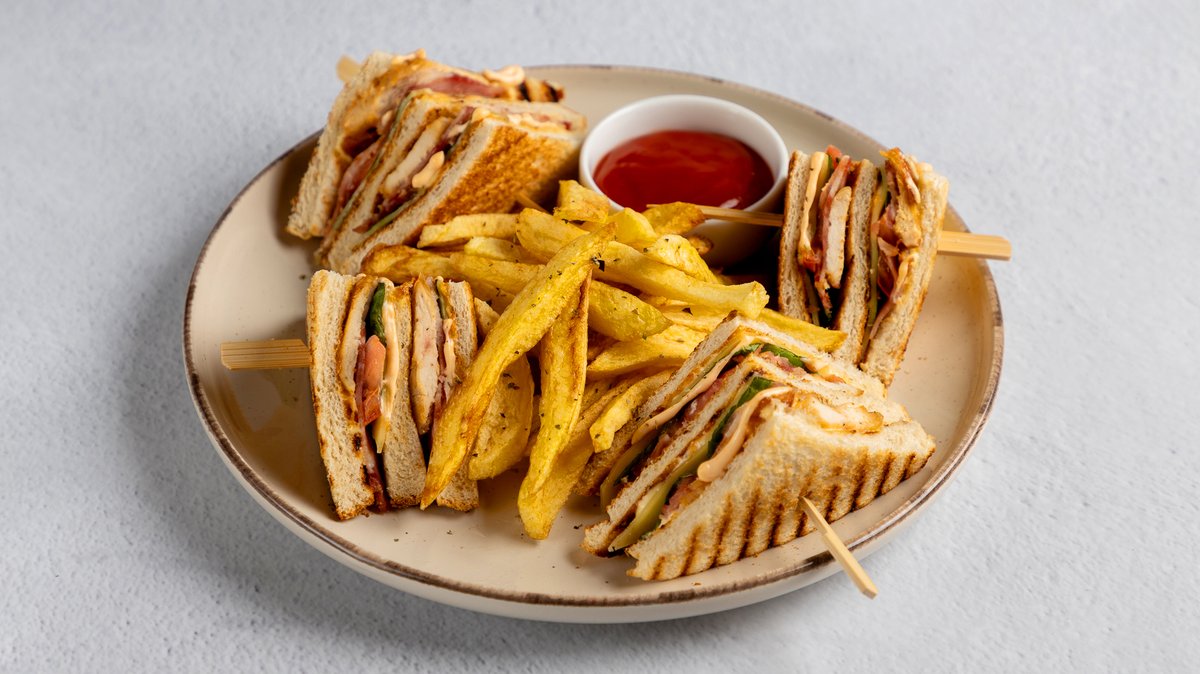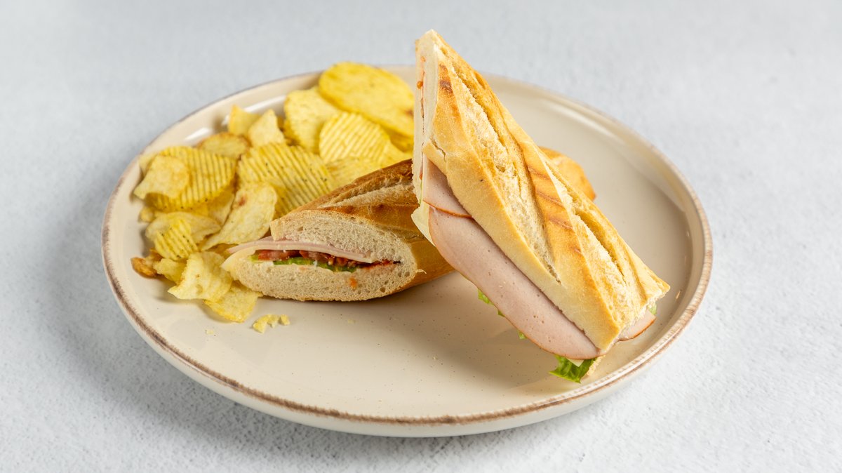 Με τυρί, ζαμπόν, μπέικον, μαρούλι, ντομάτα, mayo και φρέσκες τηγανητές πατάτες