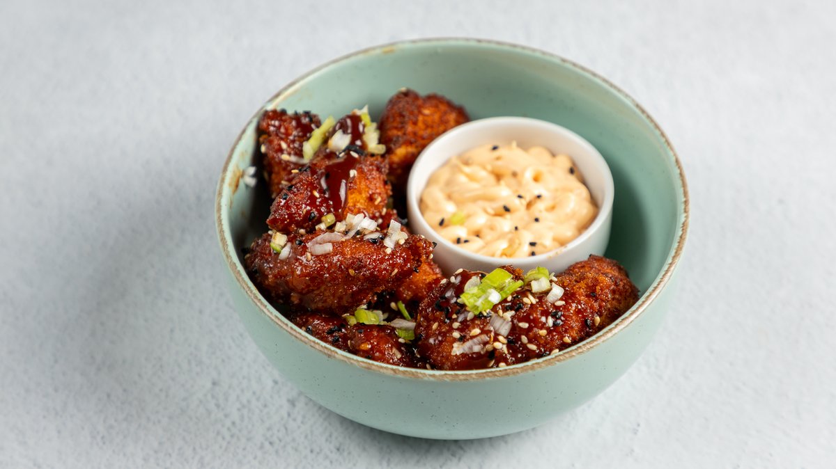 Κοτομπουκιές με σάλτσα BBQ, σουσάμι, φρέσκο κρεμμύδι και spicy mayo