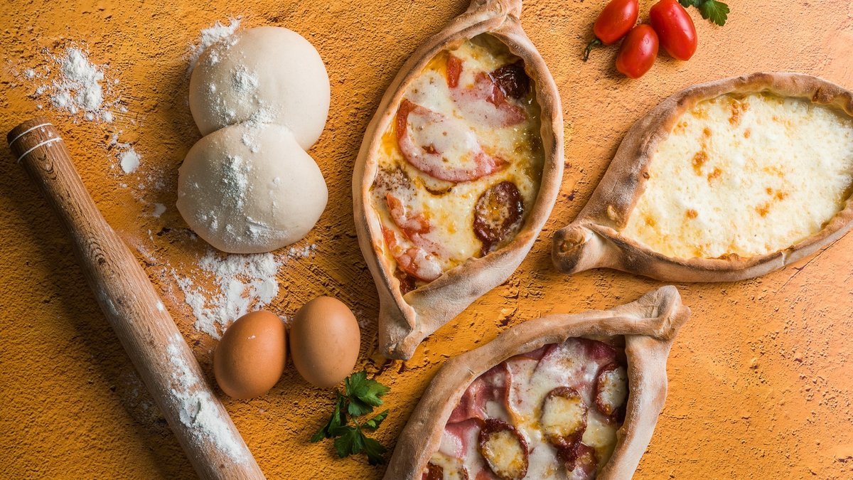 With tomato sauce, mixed cheeses (gouda, edam and mozarella), feta, tomato, oregano and olive