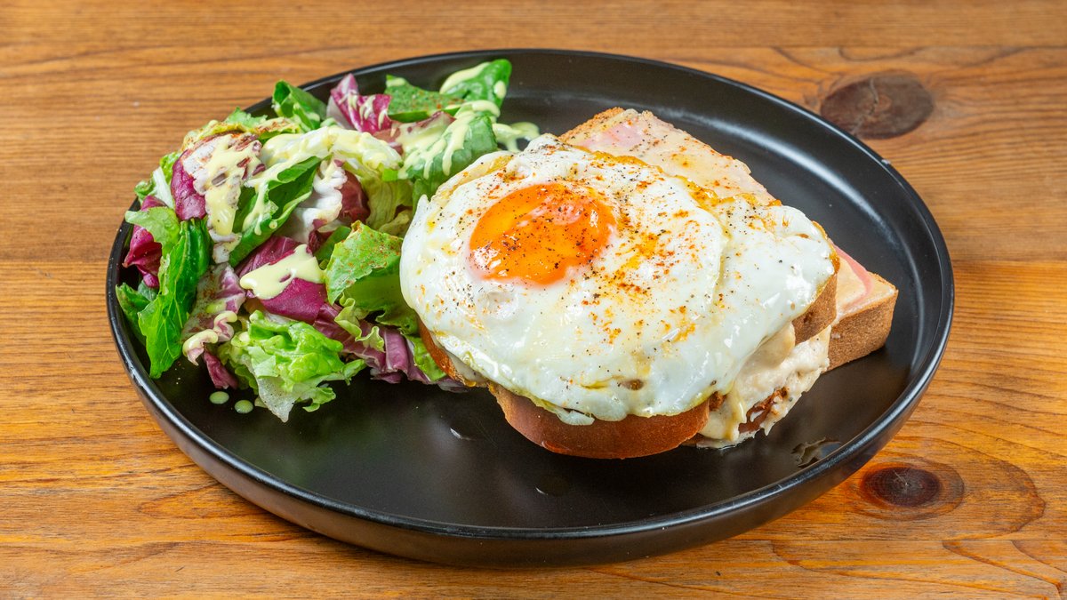 Με 1 αυγό μάτι, ψωμί brioche, μπεσαμέλ, ζαμπόν και gouda. Συνοδεύεται από σαλάτα