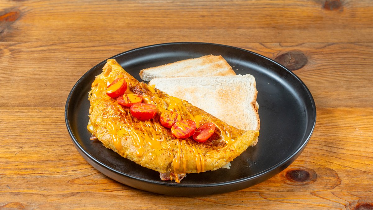 Με 3 αυγά, κοτόπουλο, gouda, μπέικον, cheddar και ντομάτα. Συνοδεύεται από φρυγανισμένο ψωμί