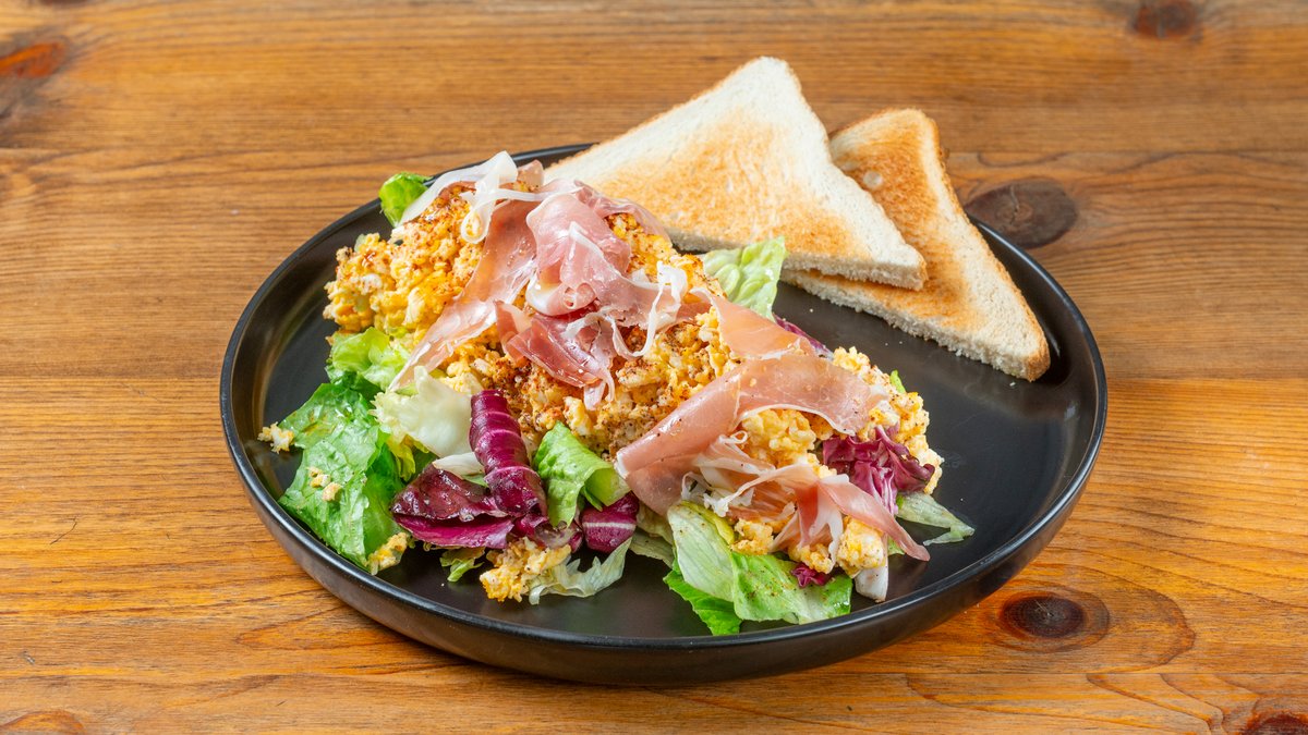 Με αυγά και προσούτο. Συνοδεύεται από φρυγανισμένα ψωμί και σαλάτα