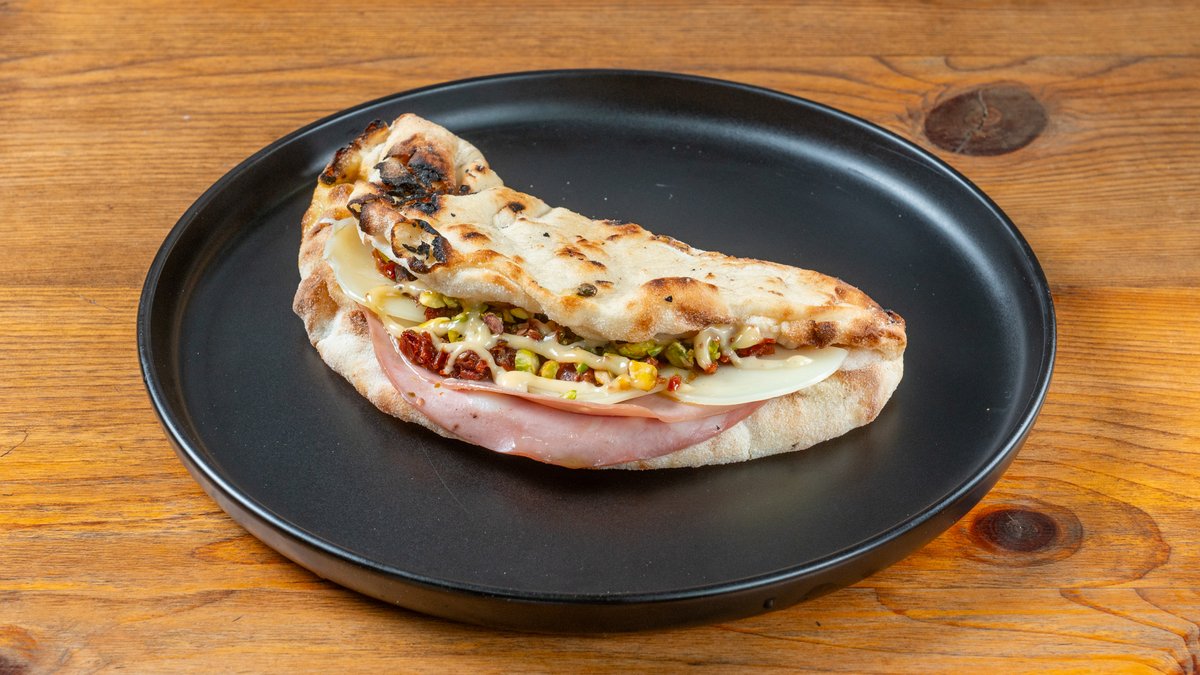 Με μορταδέλα, honey mustard, λιαστή ντομάτα, provolone και φυστίκι αιγίνης