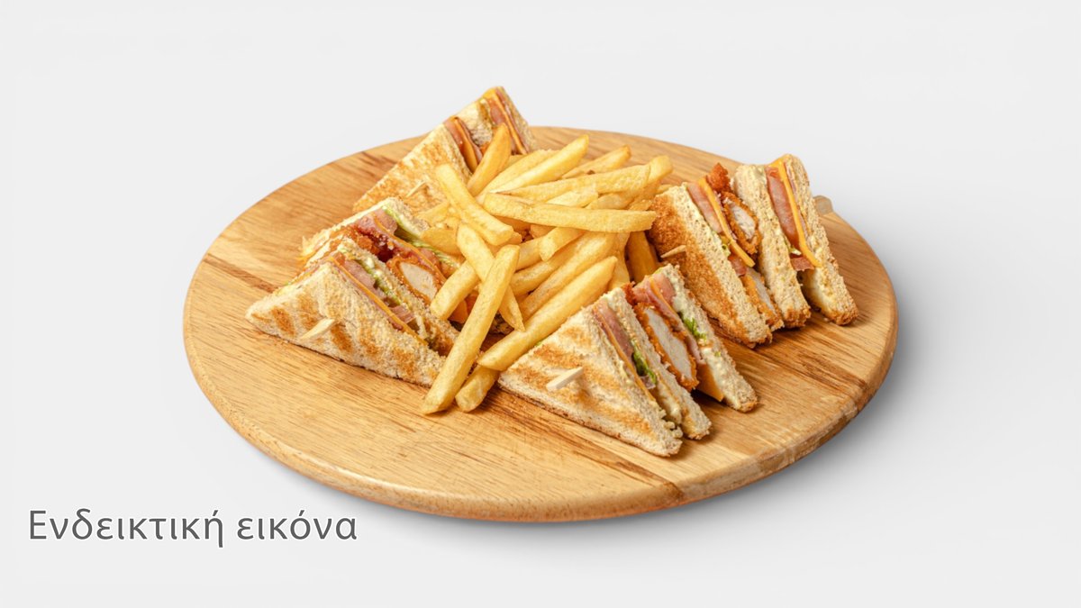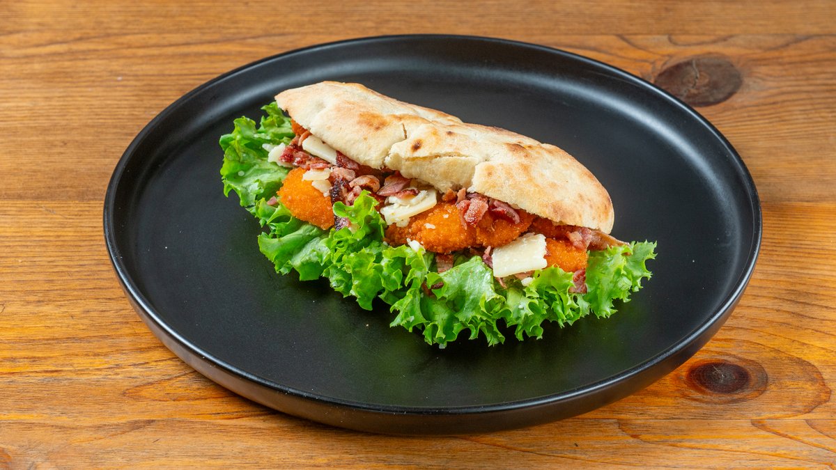 Με φιλέτο κοτόπουλο, gouda, μπέικον, ντομάτα, λόλα και μαγιονέζα. Συνοδεύεται από τηγανητές πατάτες