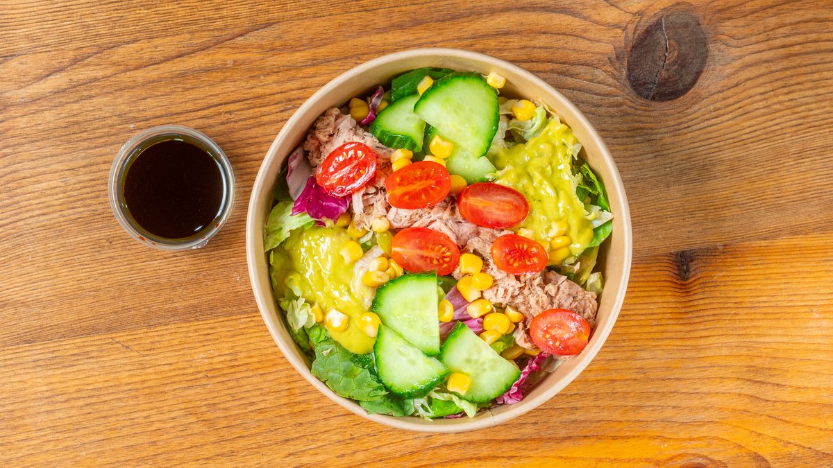 Με σαλάτα με τόνο, αγγούρι, ντοματίνια, καλαμπόκι, avocando και dressing λεμονιού