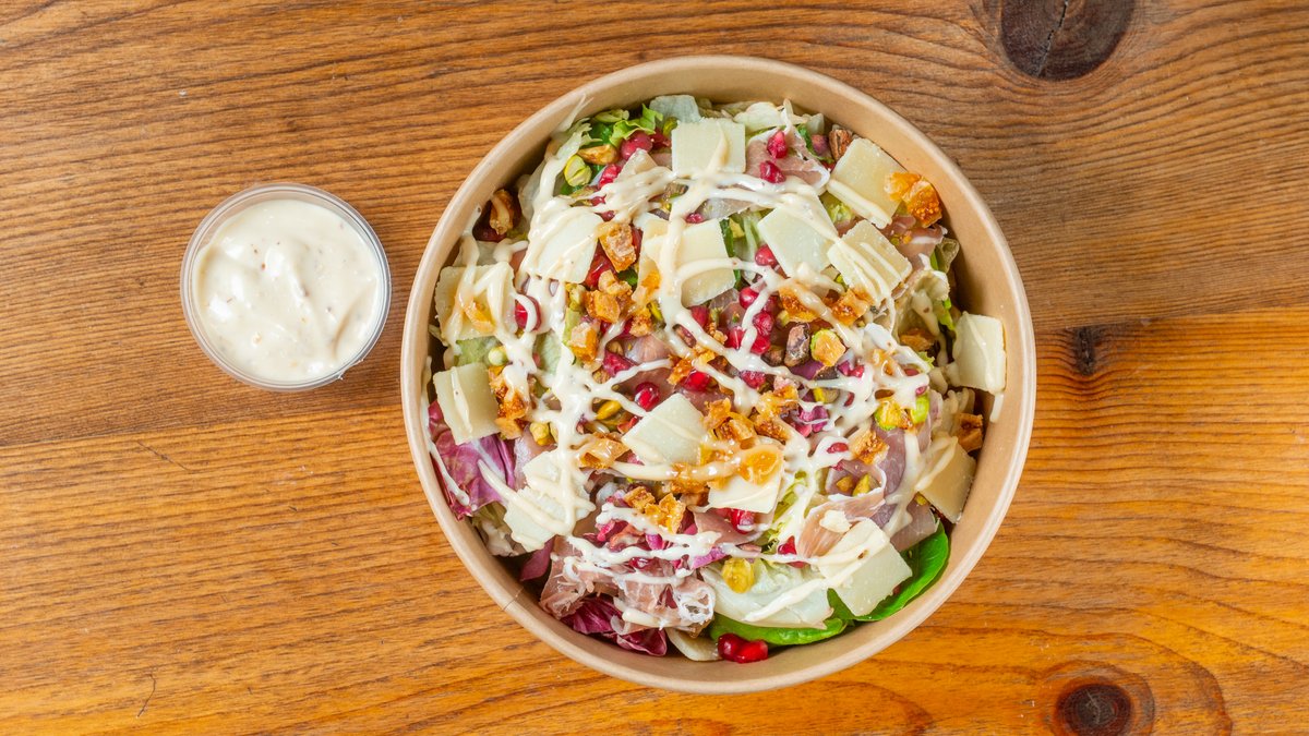 Με σαλάτα με κοτομπουκιές, μπέικον, κρουτόν και παρμεζάνα