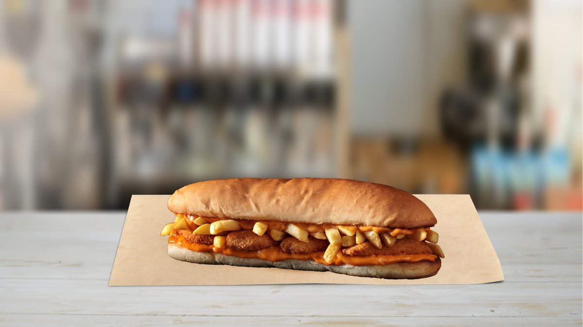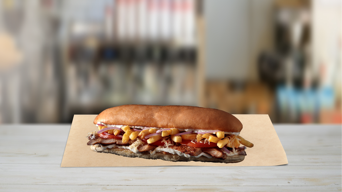 Fluffy bread with pork steak, grated gouda, onion, tomato, french fries, mayonnaise and hoisin sauce