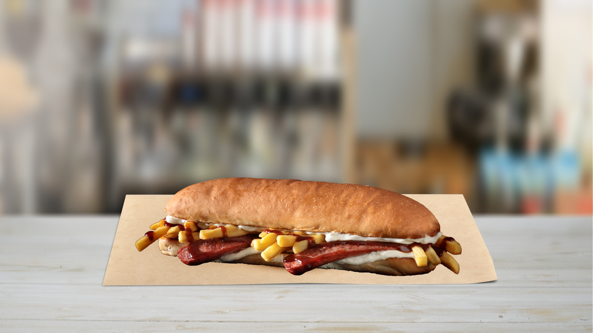 Fluffy bread with country sausage, french fries, mayonnaise and bbq sauce