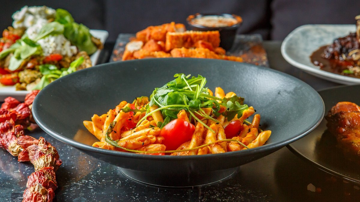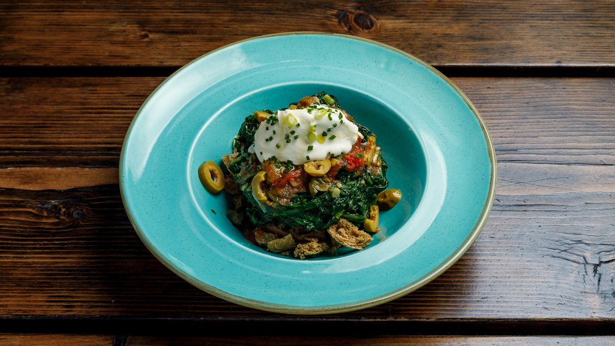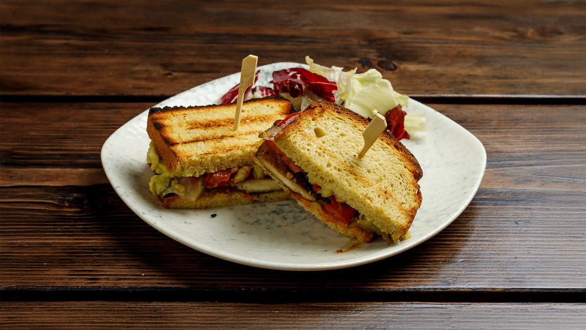 με κρέμα avocado, τομάτα, μαριναρισμένα πορτομπέλο και πίκλα αγγουριού. Συνοδεύεται από σαλάτα.