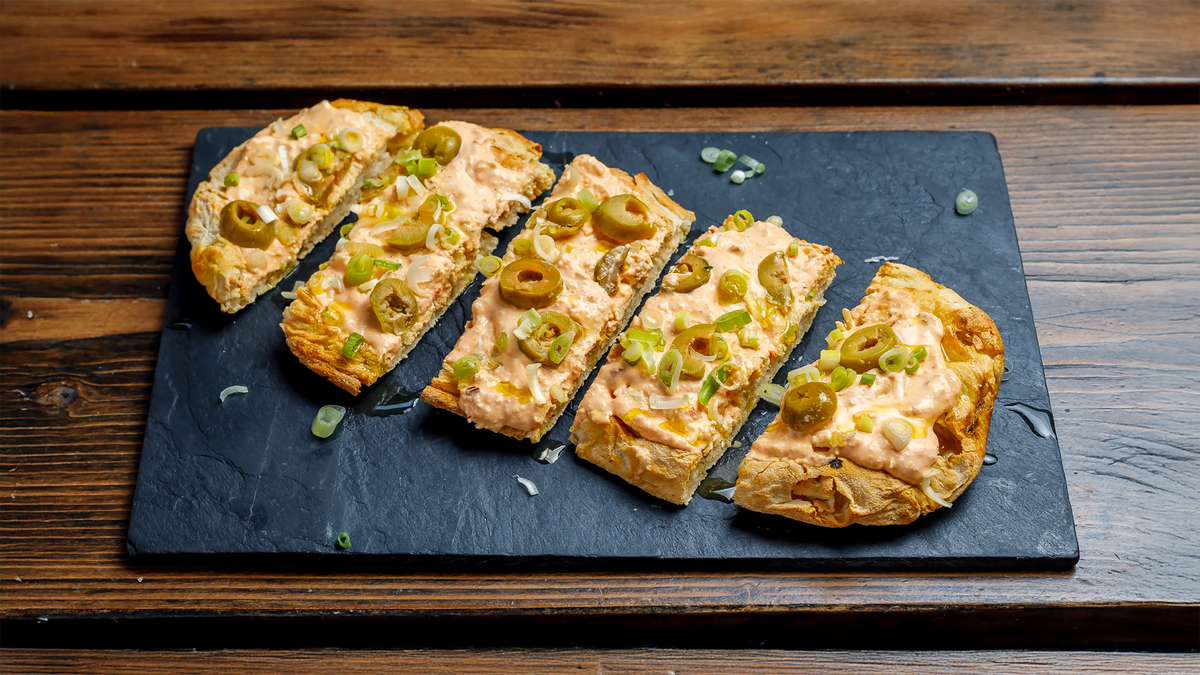 Με Τυροκαυτερή, φρέσκο κρεμμυδάκι και ελιές