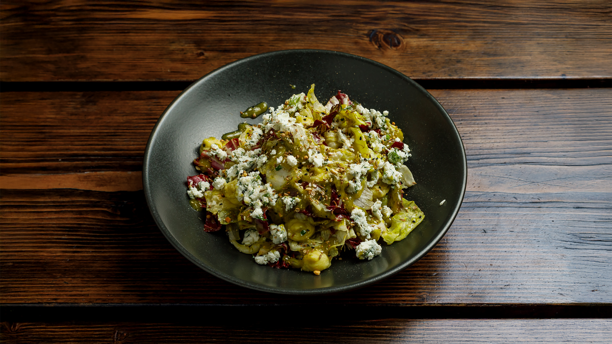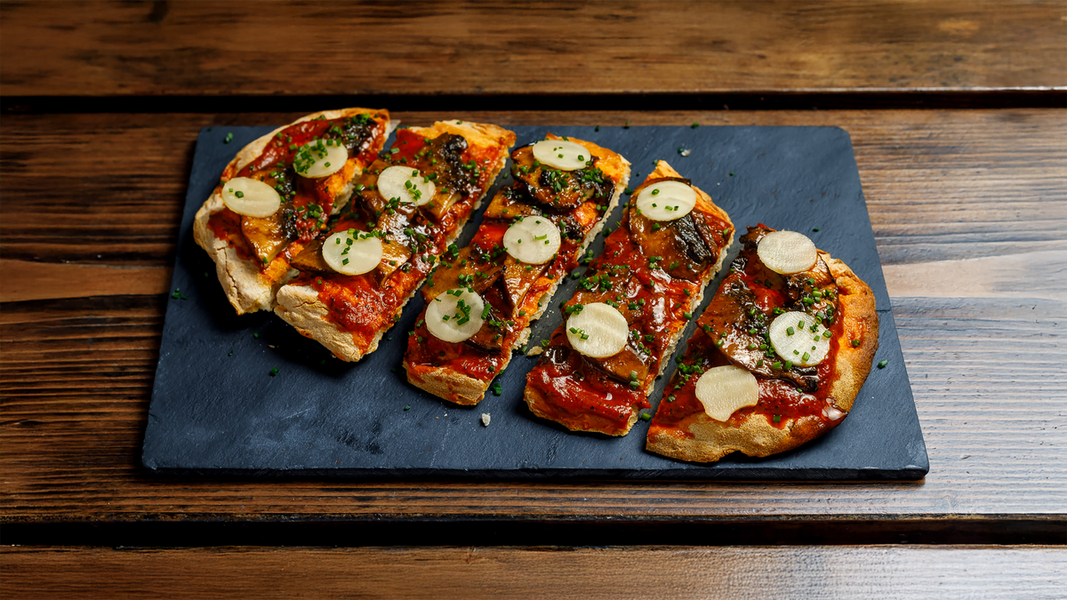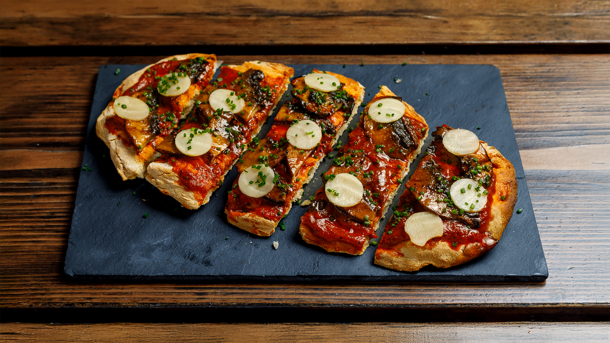 Με κρέμα πιπεριάς φλωρίνης, μαριναρισμένα πορτομπέλο, πίκλα κίτρινου παντζαριού και chives