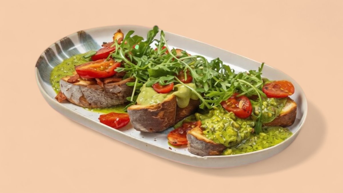 Χειροποίητο μπριός ψωμί, vegan ομελέτα, φυτικό μπέικον, τομάτα