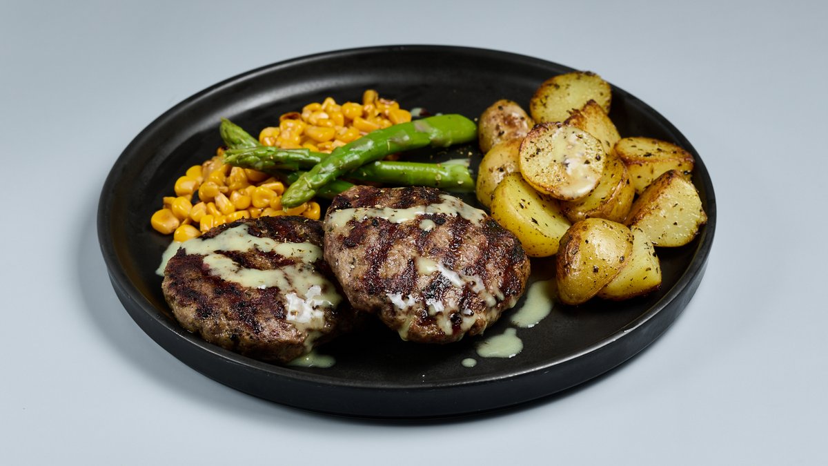 Μοσχαρίσιο μπιφτέκι Black Angus, πατάτες baby, σπαράγγια, ψητό καλαμπόκι