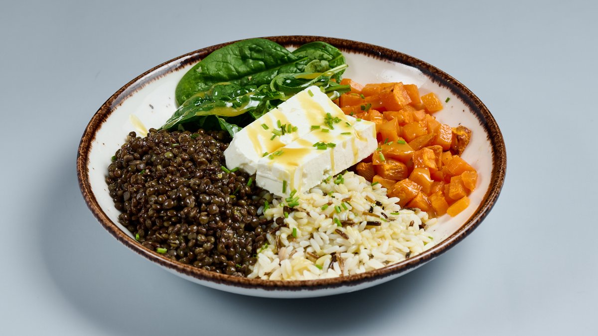 Φακές Beluga, μιξ άγριου ρυζιού, φέτα, γλυκοπατάτα, baby σπανάκι, σχοινόπρασο, dressing βαλσάμικο