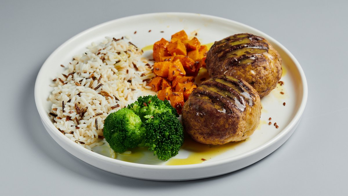 Μπιφτέκι Beyond με ρύζι μπασμάτι, λιναρόσποτο, μπρόκολο και γλυκοπατάτα