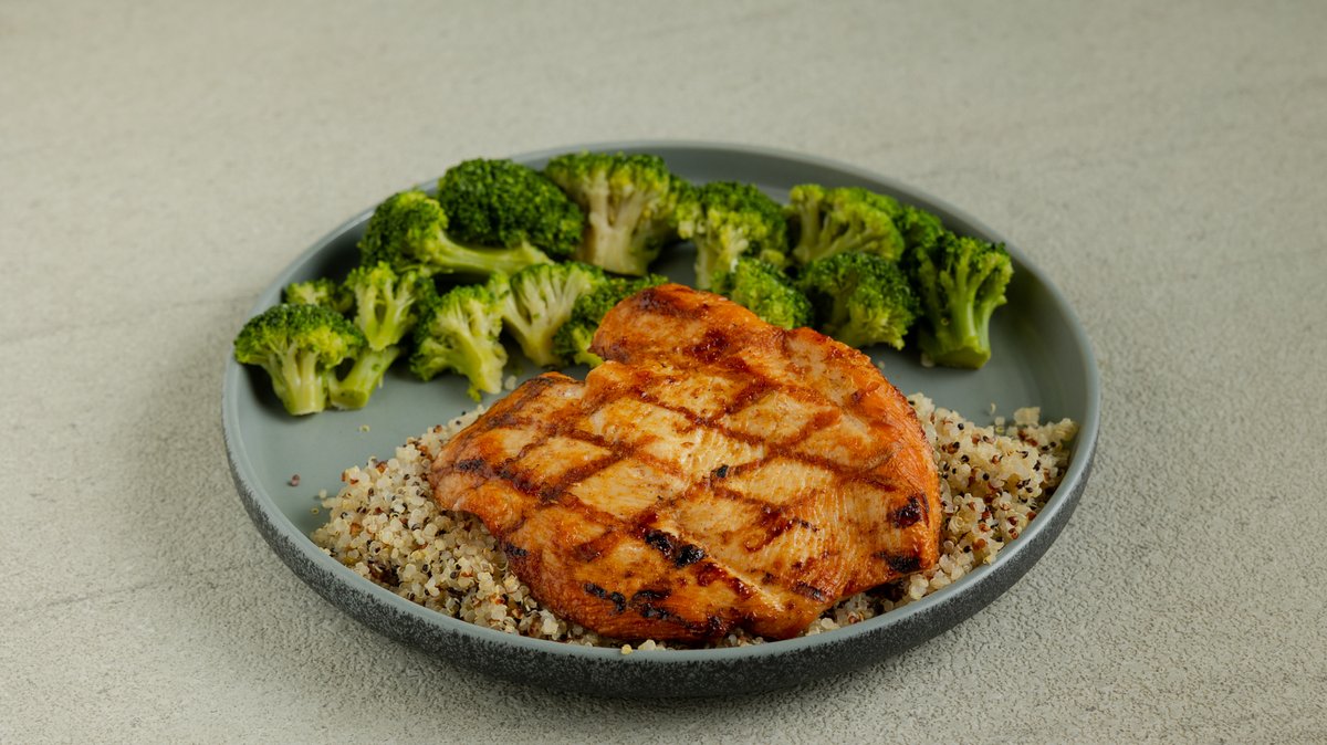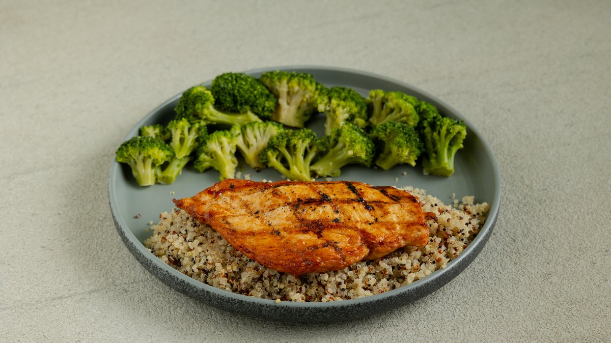 Φιλέτο κοτόπουλο στήθος (150g), κινόα τρίχρωμη (100g), μπρόκολο στον ατμού (120g). 335kcal, 43g protein, 30g carbs, 5g fat