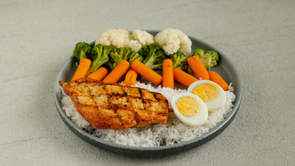 Φιλέτο κοτόπουλο στήθος (225g), ρύζι μπασμάτι (150g), 1 αυγό βραστό, λαχανικά ατμού (100g). 515kcal, 63g protein, 45g carbs, 10g fat