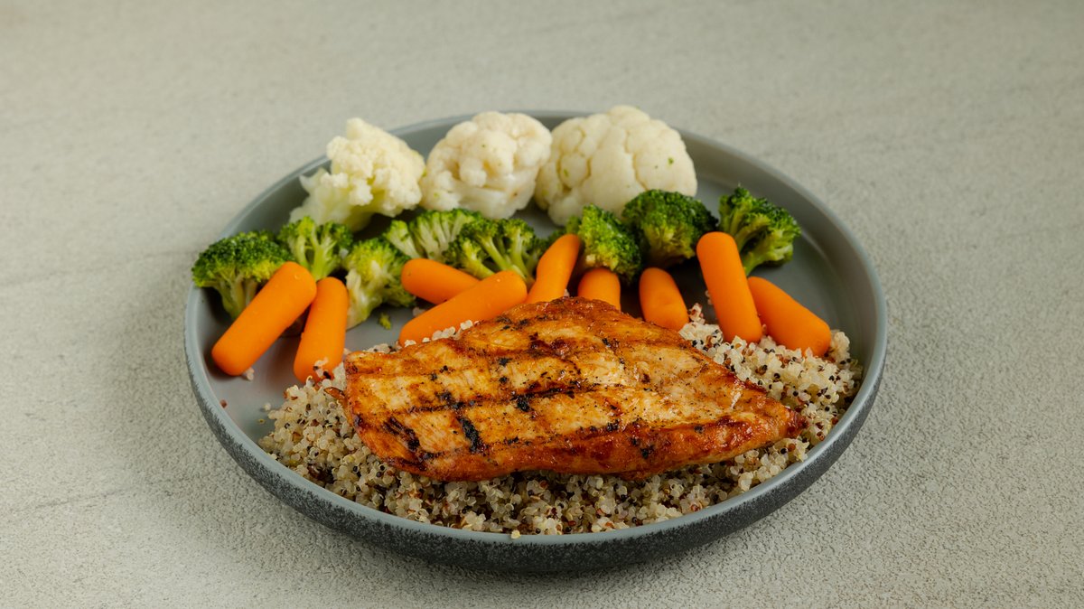 Φιλέτο κοτόπουλο στήθος (225g), κινόα (200g), λαχανικά στον ατμό (100g). 530kcal, 60g protein, 52g carbs, 8g fat