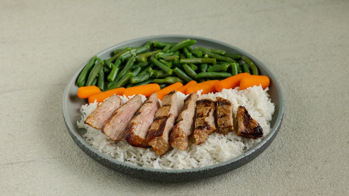 Άπαχο μοσχαρίσιο φιλέτο - κιλότο (150g), ρύζι μπασμάτι (150g) , φασολάκια πράσινα (100g), καρότα baby (80g). 560kcal, 45g protein, 55g carbs, 17g fat