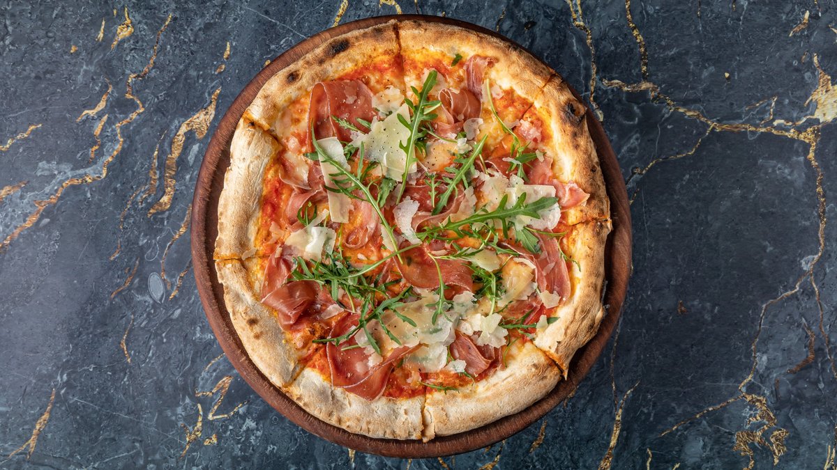 Με prosciutto, ρόκα, flakes παρμεζάνας, mozzarella, σάλτσα ντομάτας και λάδι τρούφας