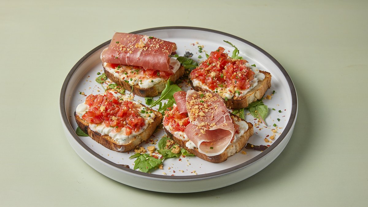 Με χειροποίητο ψωµί, κρέμα ricotta, βασιλικό, καρέ ντομάτας, prosciutto