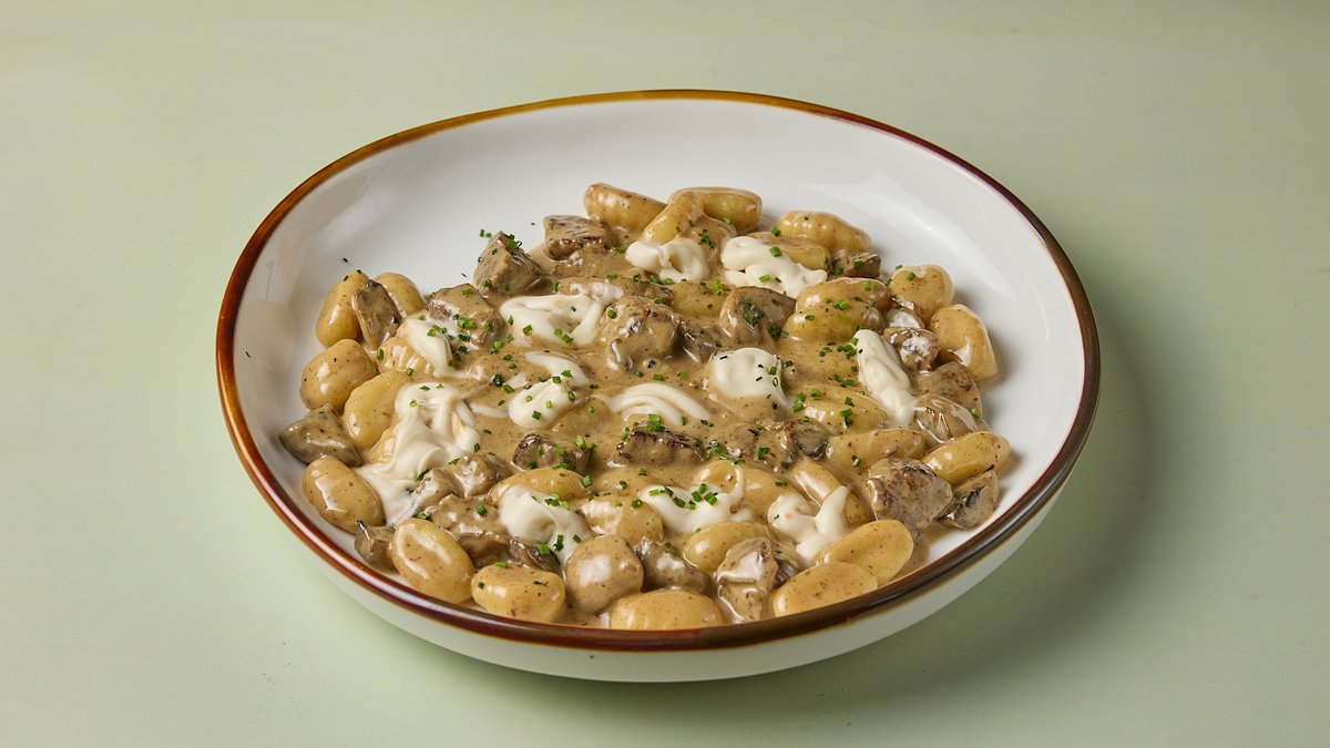 Gnocchi πατάτας με μοσχάρι ραγού, μανιτάρια, κρέμα παρμεζάνας και κρασί Marsala