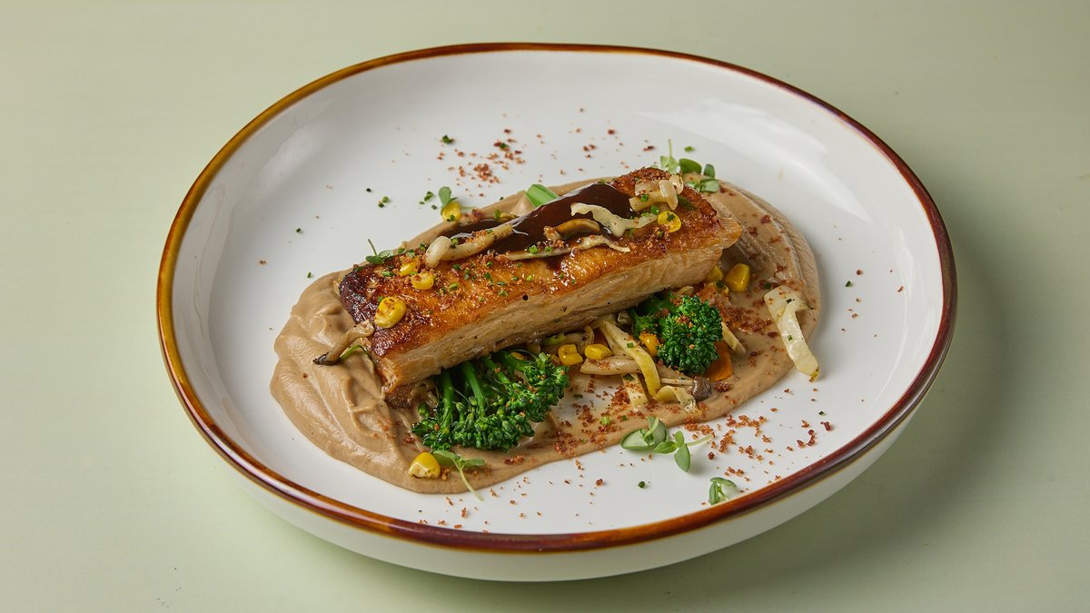 Με πουρέ από καμμένο κουνουπίδι , καρότα , σωτέ λάχανο, μανιτάρια shimeji , σελινόριζα και baby πατάτες
