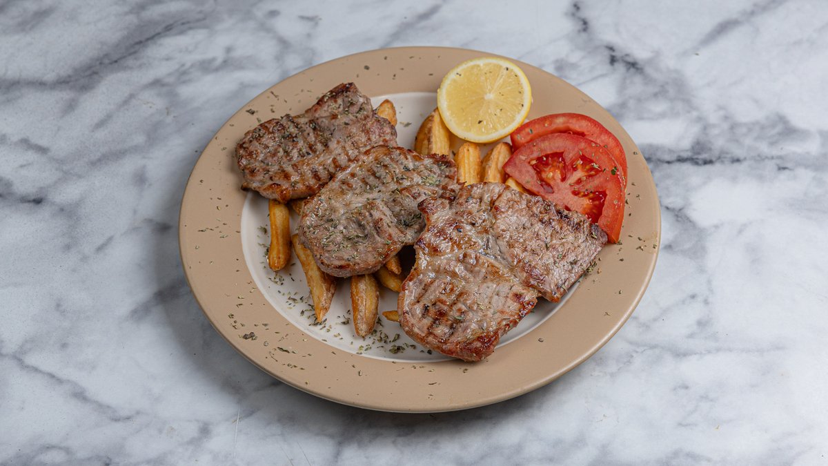 With 1 pork chop, 1 beef patty, 1 chicken skewer, and 1 chicken sausage skewer. Served with fried potatoes and tzatziki