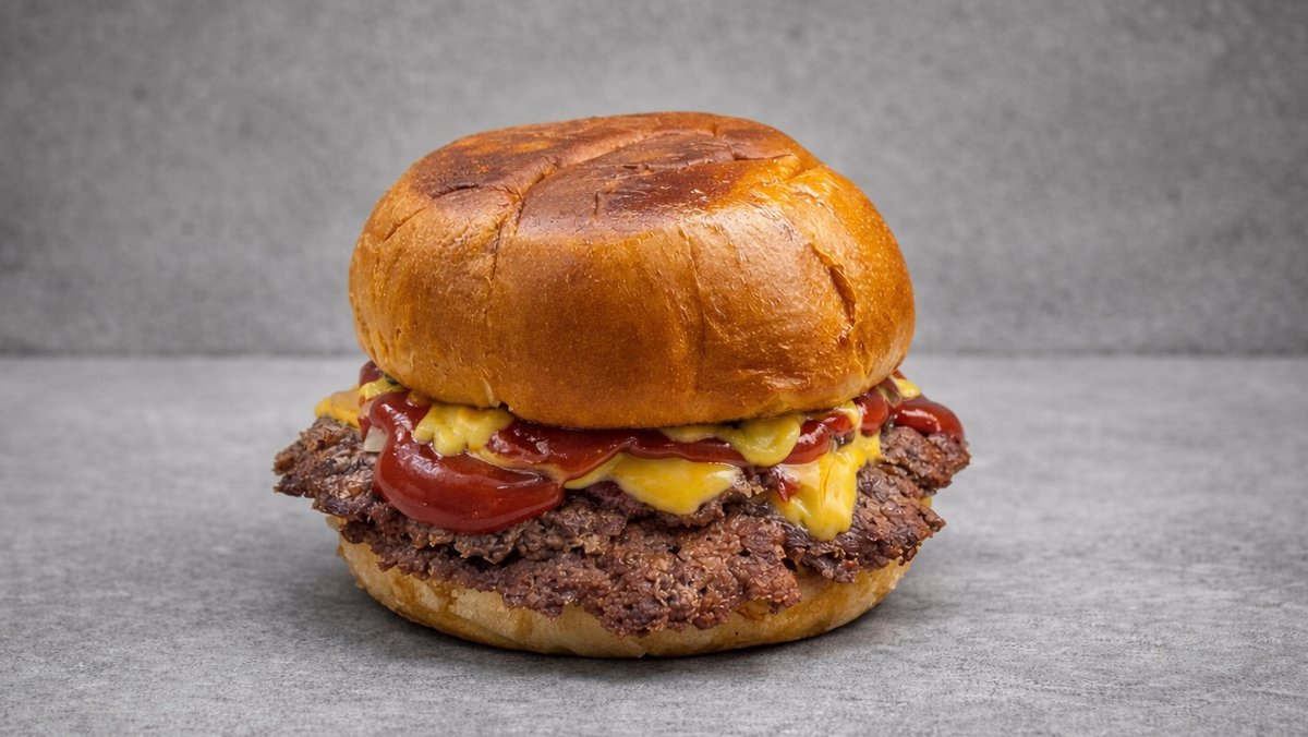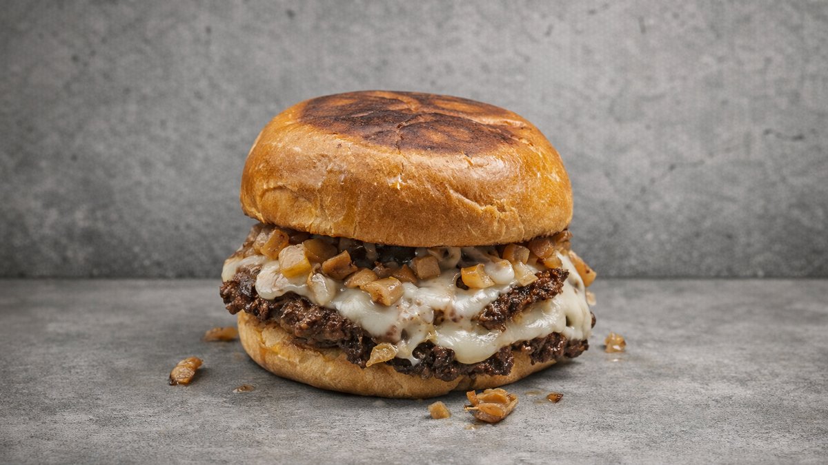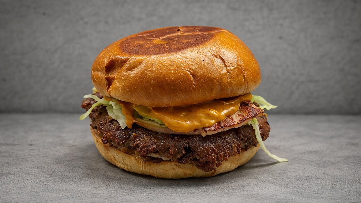 Brioche Βουτύρου με Διπλό Μοσχαρίσιο Μπιφτέκι Smash 180gr , Λευκό Cheddar Ωρίμανσης, Mix μανιταριών, Σιγομαγειρεμένα κρεμμύδια σε Πλούσιο σε Umami Ζωμό Dashi & White Truffle-Mayo.