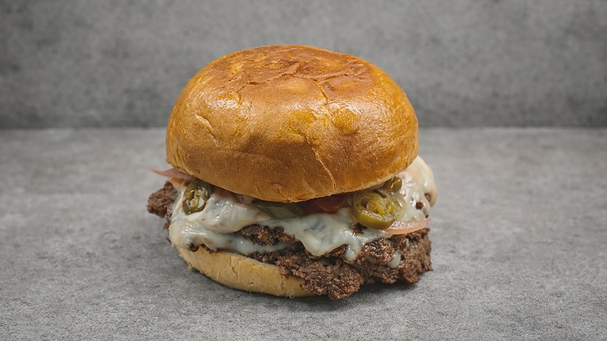 Brioche Βουτύρου με Διπλό Μοσχαρίσιο Μπιφτέκι Smash 180gr, Διπλό Λευκό Cheddar Ωρίμανσης, Πίκλες Jalapeños Ψητές , Σπιτική Πίκλα Κρεμμύδι & Spicy Mayo με Μπούκοβο.