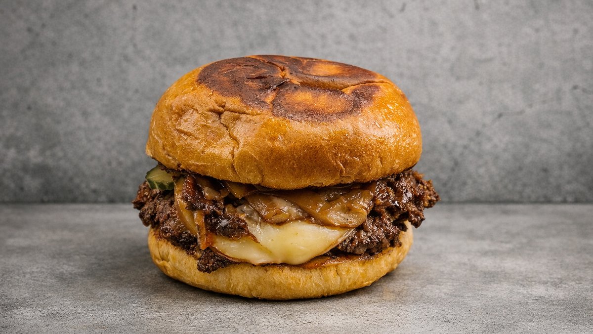 Brioche Βουτύρου με Διπλό Μοσχαρίσιο Μπιφτέκι Smash 180gr, Καπνιστό Τυρί, Σπιτική Πίκλα Αγγούρι,Σπιτικό Καραμελωμένο Κρεμμύδι & Black Garlic Sauce.