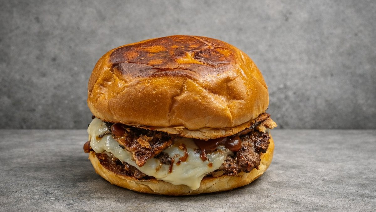 Brioche Βουτύρου με Διπλό Μοσχαρίσιο Μπιφτέκι Smash 180 gr , Διπλό Λευκό Cheddar Ωρίμανσης, Καπνιστή Pancetta, Τηγανητό Τραγανό Κρεμμύδι & BBQ-Mayo Sauce.