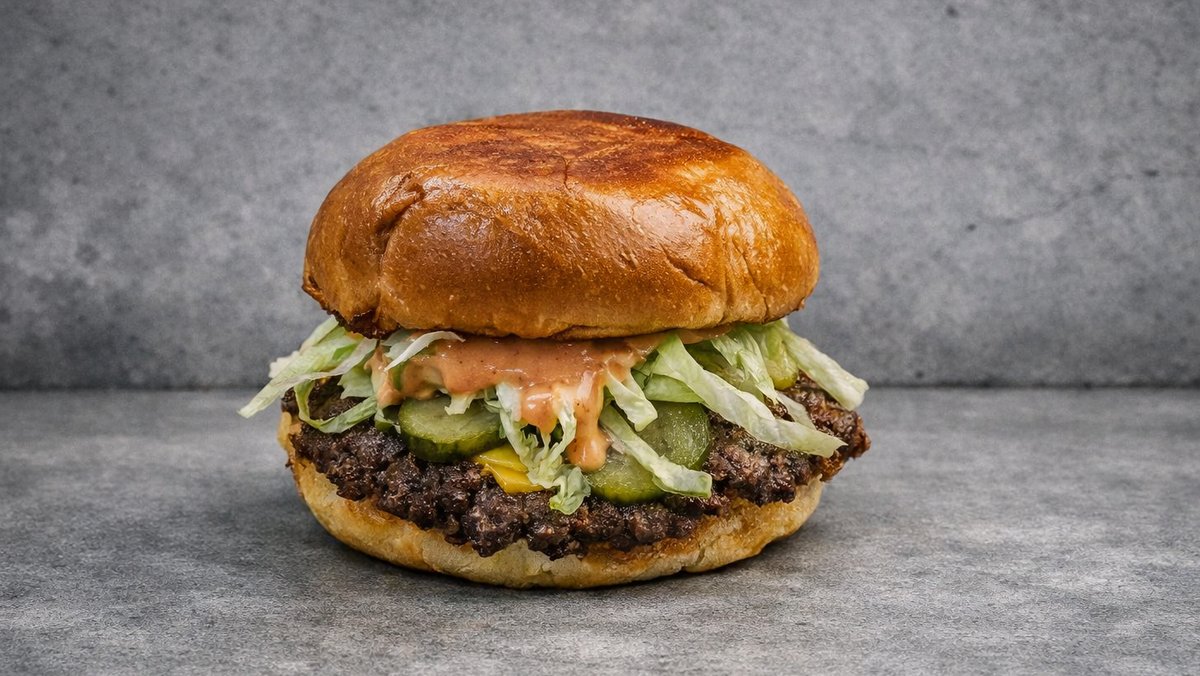 Brioche Βουτύρου με Διπλό Μοσχαρίσιο Μπιφτέκι Smash 180 gr , Διπλό American cheese, Σπιτική Πίκλα Αγγούρι, Ψιλοκομμένο κρεμμύδι, Ψιλοκομμένο Iceberg & Secret Sauce.