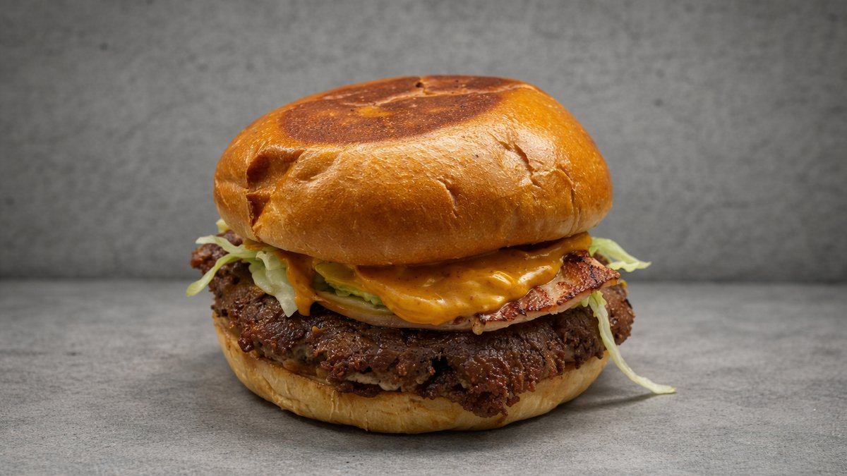 Brioche Βουτύρου με Διπλό Μοσχαρίσιο Μπιφτέκι Smash 180 gr, Καπνιστή Πανσέτα, Διπλό Καπνιστό Τυρί , Iceberg & Smoky Mayo