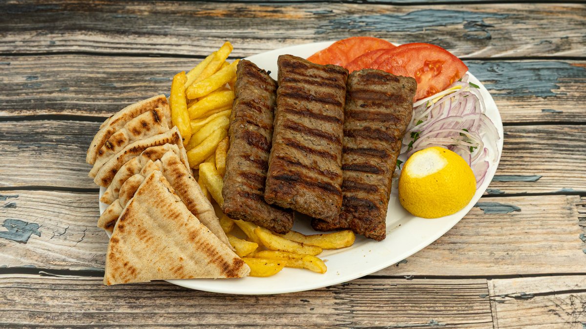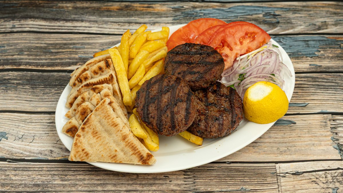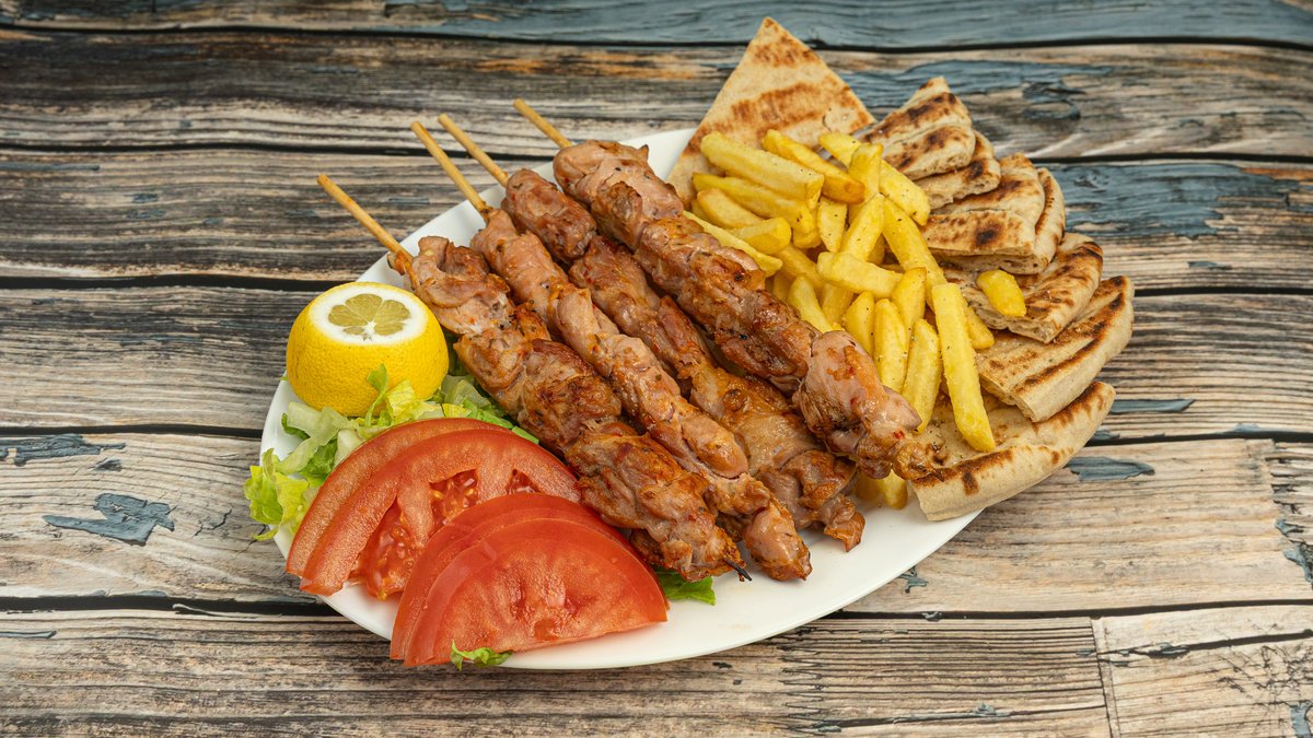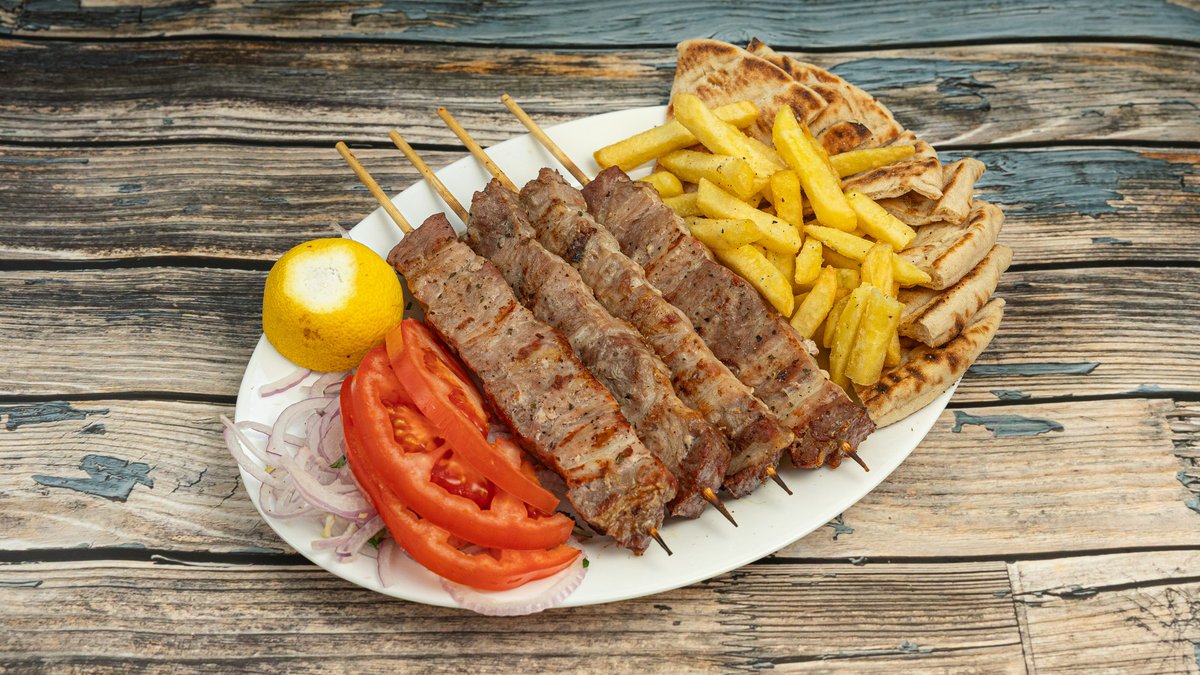 Συνοδεύεται από ντομάτα, κρεμμύδι, τζατζίκι, πατάτες και πίτες