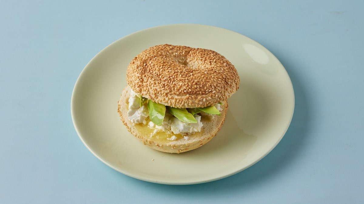 Bagel σουσαμιού με αβοκάντο, φέτα, μουστάρδα, μέλι