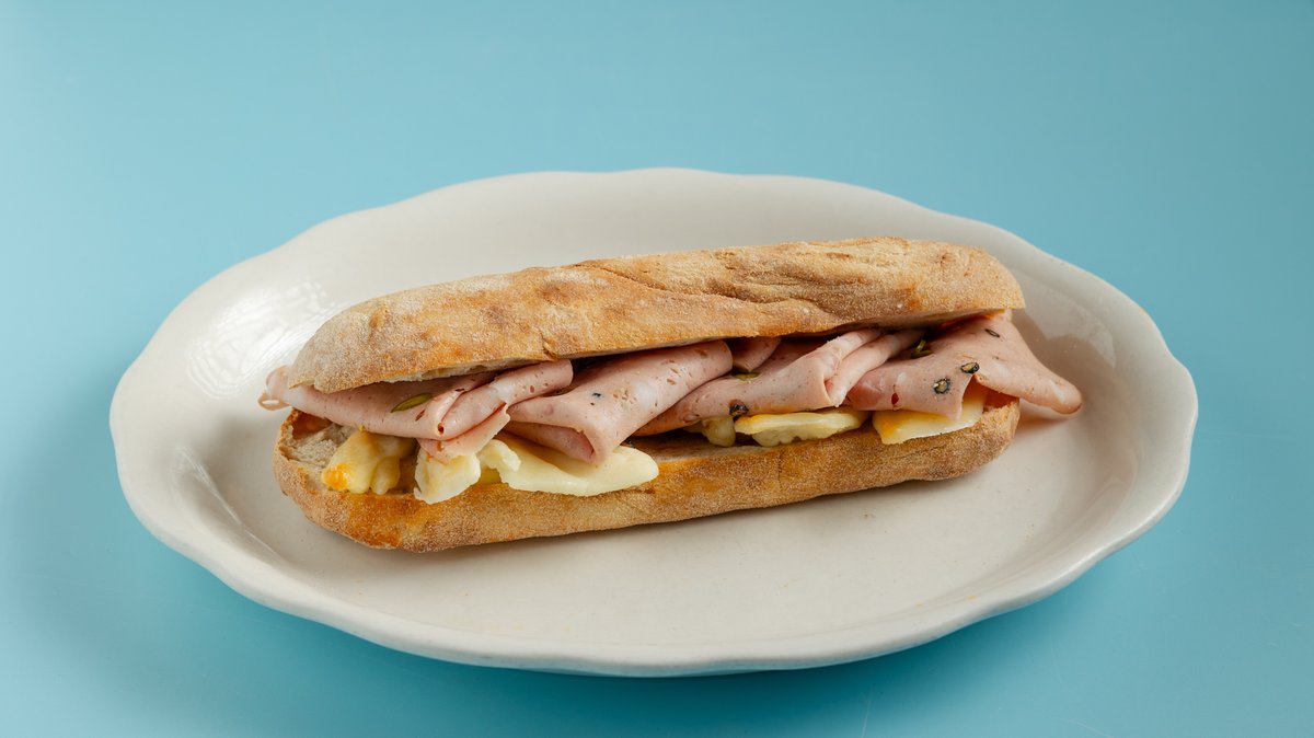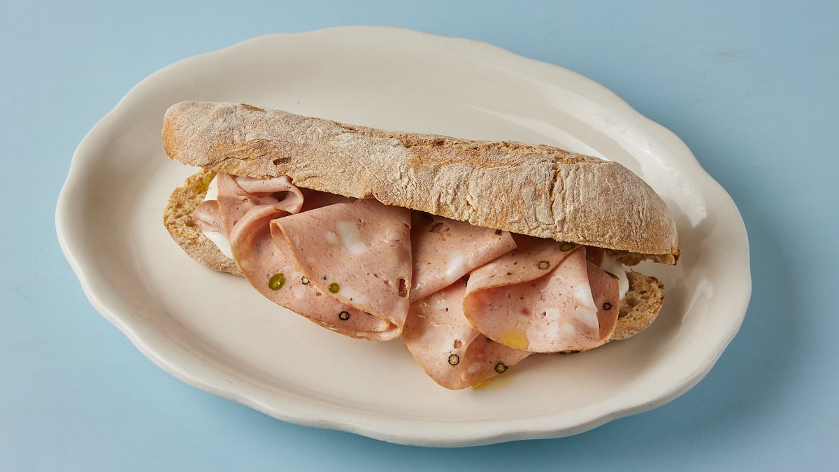 Sandwich σε μπαγκέτα καμπαγιού με μορταδέλα, pesto φυστίκι, στρατσιατέλα, ελαιόλαδο