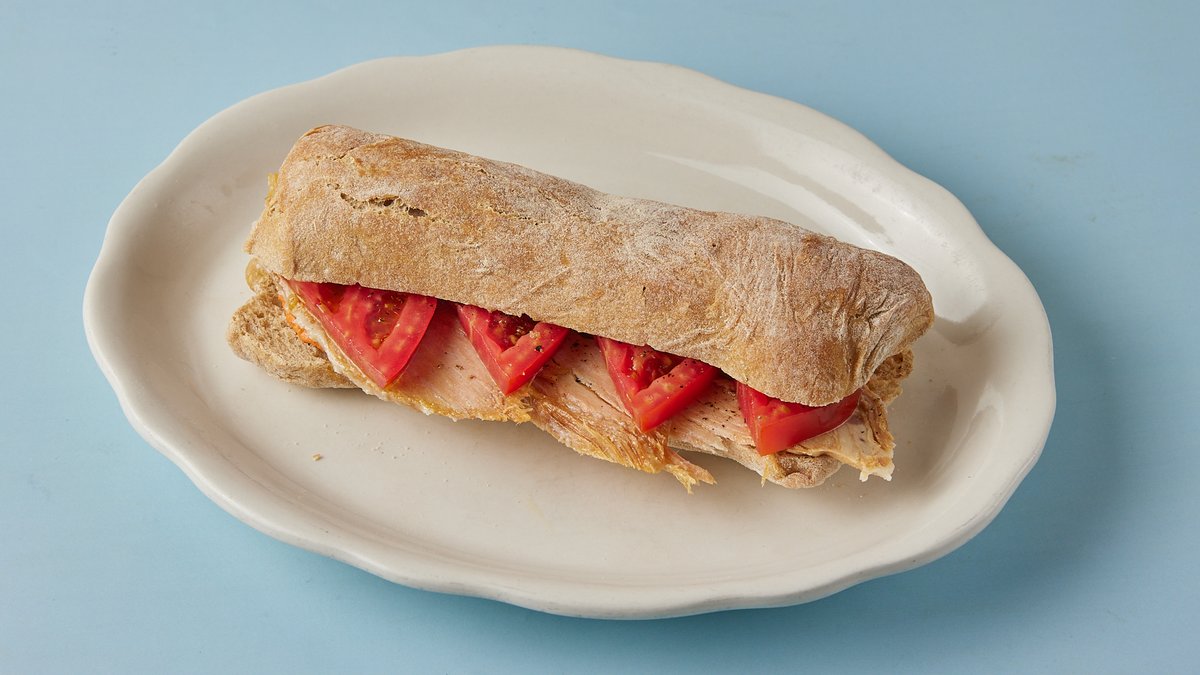Sandwich σε μπαγκέτα καμπαγιού με ψητά ντοματίνια, pesto βασιλικού, φυστίκι, μπουράτα, άγρια ρόκα, ελαιόλαδο, τσίλι