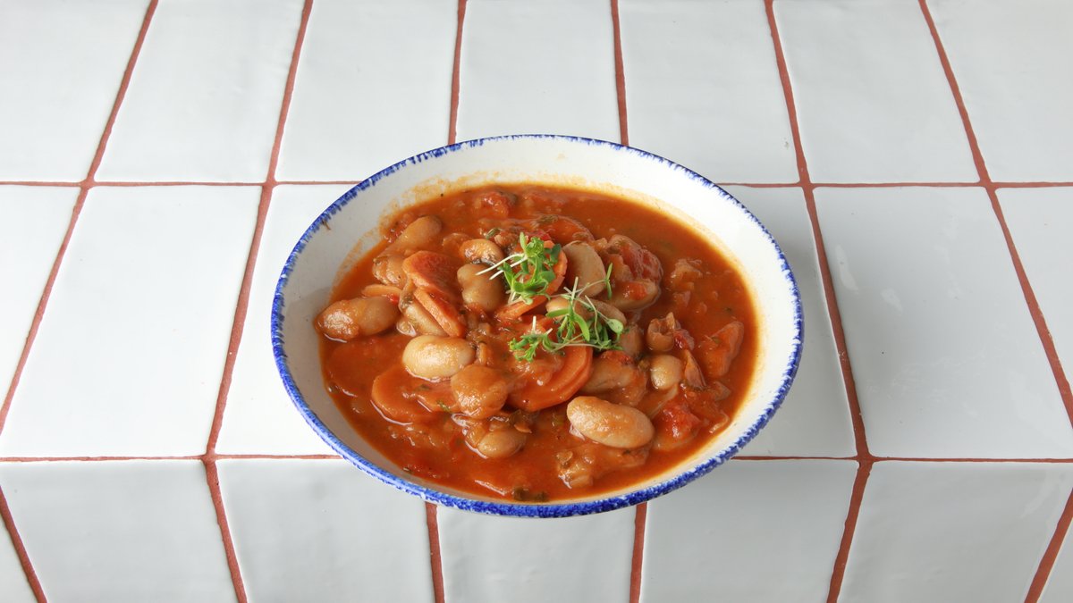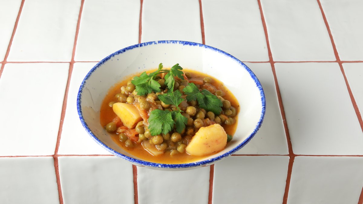 Από πράσινη φάβα με σαλάτα από λιαστές ντομάτες, μελιτζάνα και θρούμπι. Το πιάτο περιέχει σημαντικές ποσότητες Β βιταμινών που βοηθούν το νευρομυικό σύστημα Ενέργεια 404 kcal, λιπαρά 27 g εκ των οποίων κορεσμένα 4.5 g, υδατάνθρακες 32 g εκ των οποίων κορεσμένα σάκχαρα 10 g, φυτικές ίνες 8.5 g, πρωτεΐνη 11 g και αλάτι 0.9 g