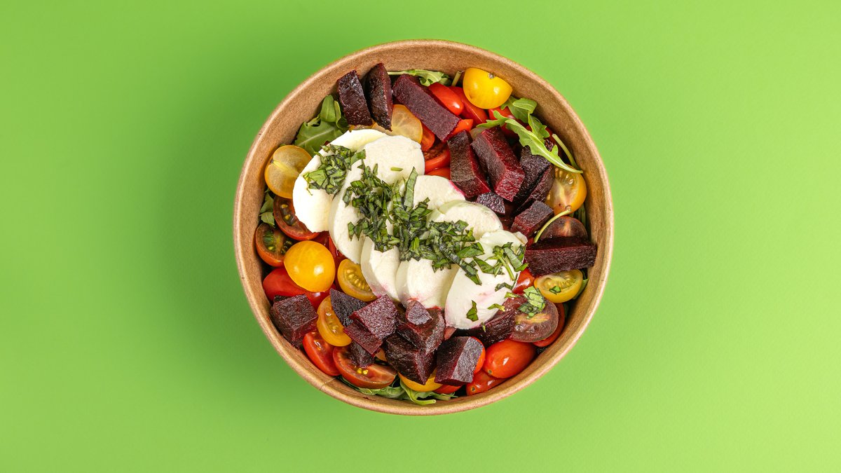Σαλάτα με ντοματίνια, ρόκα, παντζάρι, mozzarella, βασιλικό φρέσκο και dressing με pesto, αλάτι και πιπέρι